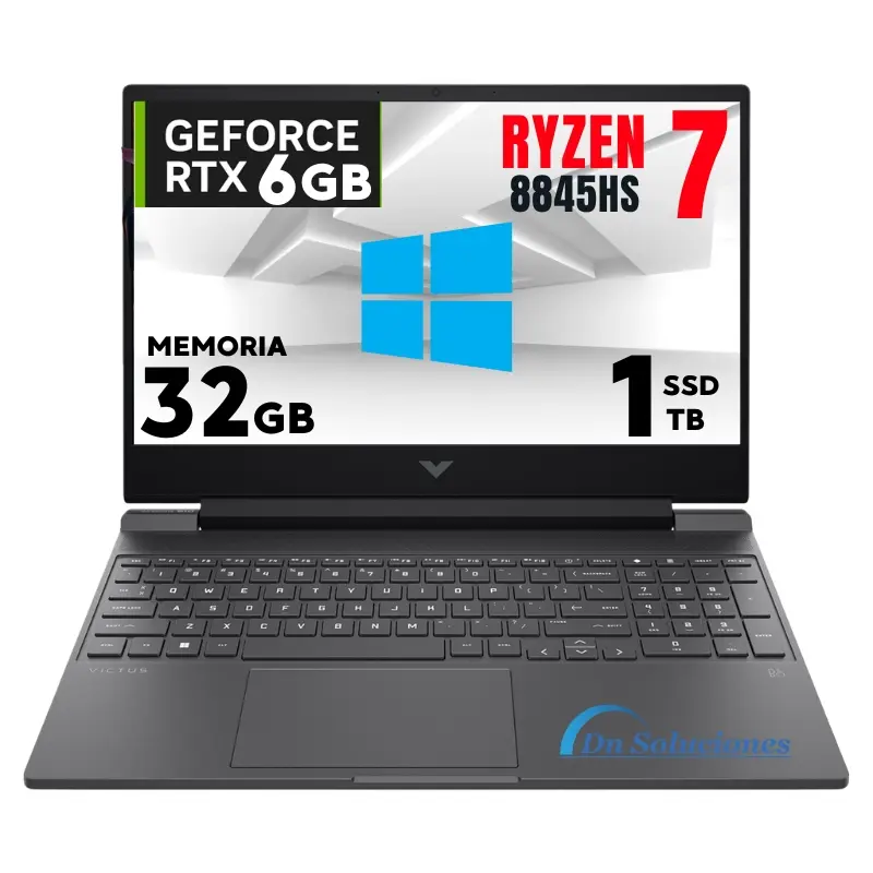 Descubre la Laptop gamer HP Victus 15-fb2020la Ryzen 7 8845HS RTX 4050 RAM 32 GB SSD 1 TB en Ecuador. Ideal para gaming, diseño y trabajo pesado. Procesador AMD Ryzen™ 7 Serie 8845HS, NVIDIA GEFORCE RTX™ 4050 6 Gb MEMORIA RAM 32GB DDR5 y 1TB SSD NVMe Gen4. ¡Rendimiento extremo garantizado! Envíos rápidos por Servientrega 24-48h a todo Ecuador. Visítanos en nuestra tienda física en Tumbaco, Quito (Dn Soluciones Tienda de Laptops) o compra online con factura y pago de contado hasta las 16:00 para envío el mismo día. ¡Stock disponible para entrega inmediata!